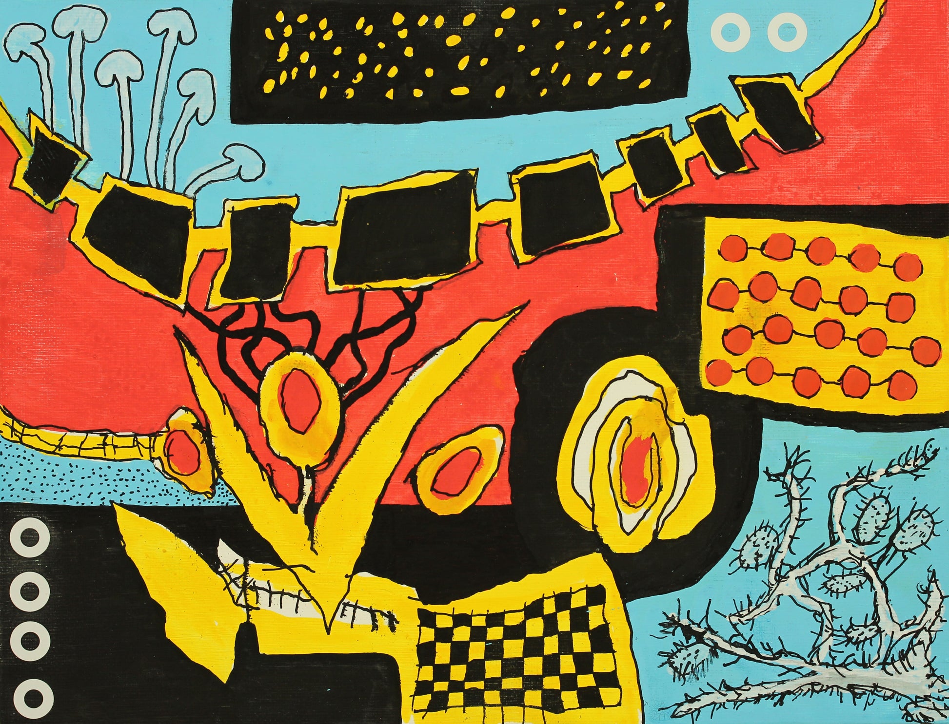 Paint pens on canvas board. As a campervan image wouldn't be very fitting considering my artistic output I decided to use the initial stencil as a starting point for an abstract piece and the result is an intuitive response to that stencil.